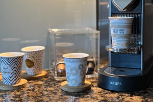 In unserem Haus lebt ein kleiner, sehr scheuer Wolfspitz, der gelegentlich Besucher im Treppenhaus meldet. Keine Sorge – er möchte nur aufpassen.